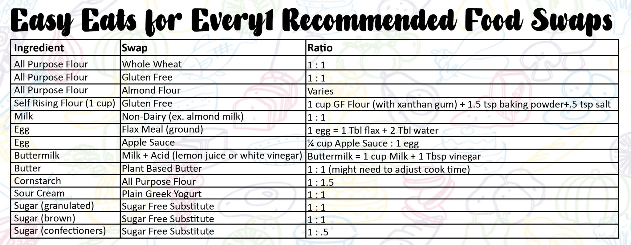 Welcome to The Easy Eats for Every1 online cookbook! Here you will find all the recipes that the Culinary Arts Team makes both in class at the Jefferson Career Exploration Center and with our Residential Community. We also invite you to follow us on our social media, for one-on-one tutorials, tips, tricks and guest chefs! If there is a recipe that you would like to try, but need an alternative ingredient please scroll to the bottom of the page for the most common food swaps!